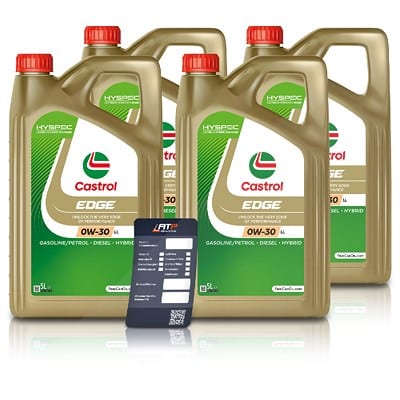 Das Produkt beinhaltet vier Kanister Castrol EDGE 0W-30 LL mit jeweils 5 Litern Inhalt (insgesamt 20 Liter) sowie einen praktischen Ölwechsel-Anhänger zur Dokumentation und Erinnerung an den nächsten Service.