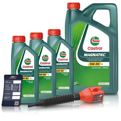 - Umfassendes Set für den Ölwechsel: Das Set beinhaltet neben dem hochwertigen Castrol MAGNATEC 5W-30 A5 auch einen praktischen Ölwechsel-Anhänger zur Erinnerung an den nächsten Service und einen benutzerfreundlichen Einfülltrichter, der für eine saubere und unkomplizierte Befüllung sorgt.