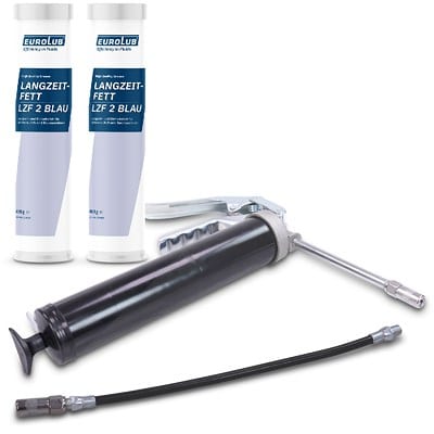 | Inhalt des Sets | 1x Einhand-Fettpresse, 1x Panzerschlauch, 2x Tube Langzeitfett (spezielle Formulierung für breite Anwendungstemperaturen und hohe Belastbarkeit). |