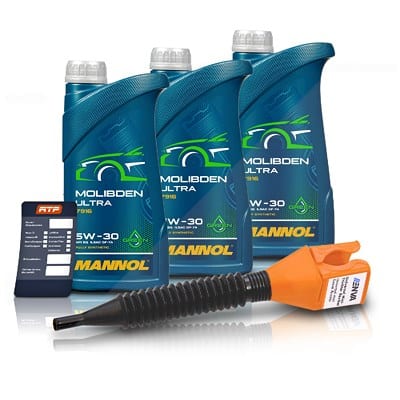 | Lieferumfang | 3 x 1 Liter Gebinde Mannol Molibden Ultra 5W-30, 1 x Ölwechsel-Anhänger, 1 x Einfülltrichter. |
