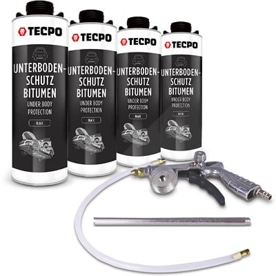 Tecpo 4x 1 L Unterbodenschutz Bitumen, schwarz + Druckluft-Sprühpistole: Langzeitschutz für Ihr Fahrzeug