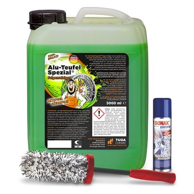 | Enthaltene Komponenten | 5 Liter Alu-Teufel Spezial® Felgenreiniger, professionelle Felgenbürste, Felgenversiegelung für langanhaltenden Schutz. |